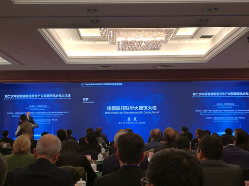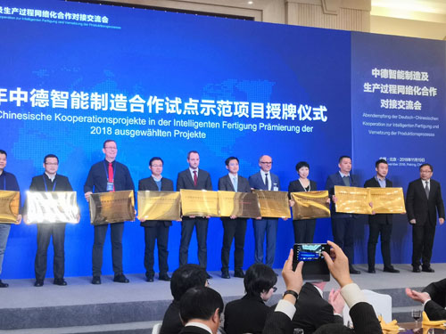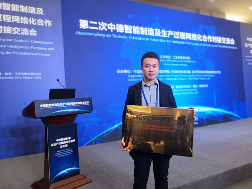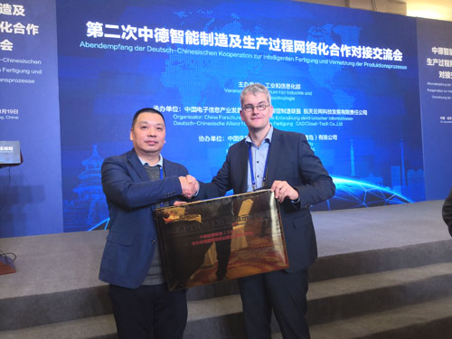 2018年11月19日,第二次中德智能制造及生产过程网络化合作论坛在北京召开,会议由工业和信息化部副部长陈肇雄出席并主持,科技部副部长张建国,德国经济和能源部议会国务秘书奥利弗·维特克、教育和研究部议会国务秘书迈克尔·梅斯特共同出席会议。来自中德两国政府部门、企业、高校、科研机构、行业协会代表共300余人参加了论坛。我司也获邀参加此次盛会,与德国弗劳恩霍夫研究所合作研究的“中德智能制造(工业4.0)-全生命周期管理的远程监管服务平台”示范项目,由工信部与软件服务业司司长谢少峰亲自授牌于我司。